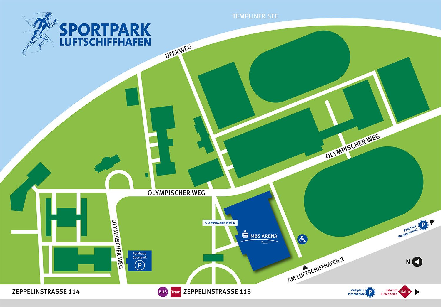 Die MBS Arena befindet sich auf dem Gelände des Sportpark Luftschiffhafen. Das Gelände ist nicht öffentlich befahrbar.
